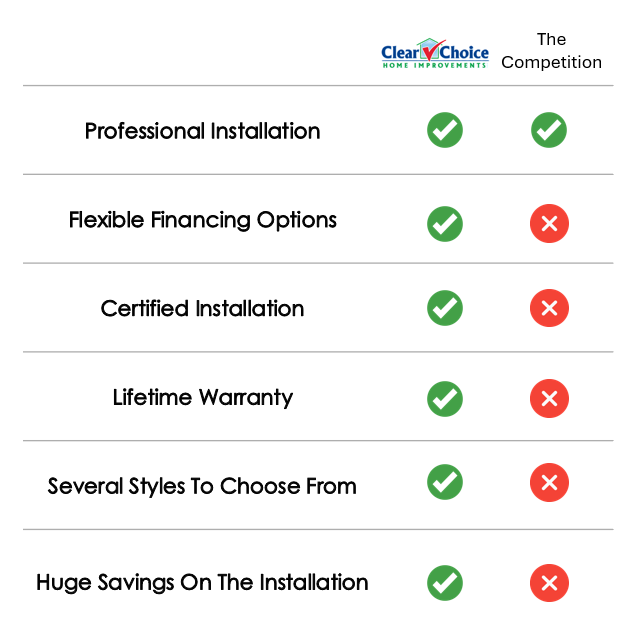 *By submitting a form, I authorize Clear Choice Home Improvements to contact me with information about its products and services via postal mail, email, phone and/or text at the contact information provided above, even if I am on the National or Local Do Not Call List. Clear Choice Home Improvements may use automated telephone technology to initiate calls to its customers. Consent is not a condition of purchase. Message/data rates apply . You may unsubscribe at any time. Privacy Policy